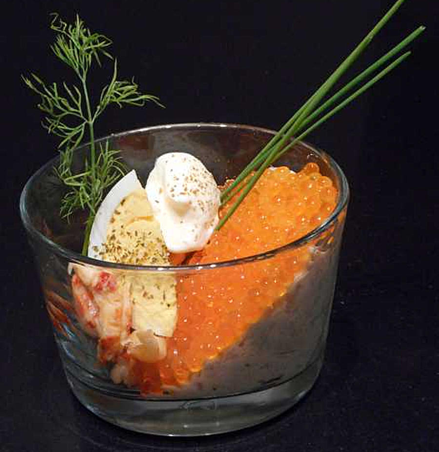 Los een paar blaadjes gelatine op in een glaasje van de nog warme bouillon en meng met de zalmpuree. Laat even afkoelen en spatel er dan opgeklopte room onder tot een smeuïge massa. Schep de bereiding in verrines.Vanaf dit punt neem jij het als hobbykok over. Ik heb de verrines diagonaal gevuld en zo laten opstijven in de koelkast. Vervolgens heb ik het platte vlak bedekt met een laagje zalmeitjes. De verdere afwerking op foto bestaat uit een plukje sla, sprietjes bieslook, een takje dille, een toefje zure room met daarop wat cayennepeper, een kwart van een hardgekookt ei en een paar gepelde rivierkreeftjes. Maar jij kan dit perfect zelf vormgeven op een andere manier, met deze of andere ingrediënten. Serveer als aperitiefhapje in een kleinere portie of zoals hier, met croutons of toastjes in de voorgerechtversie.