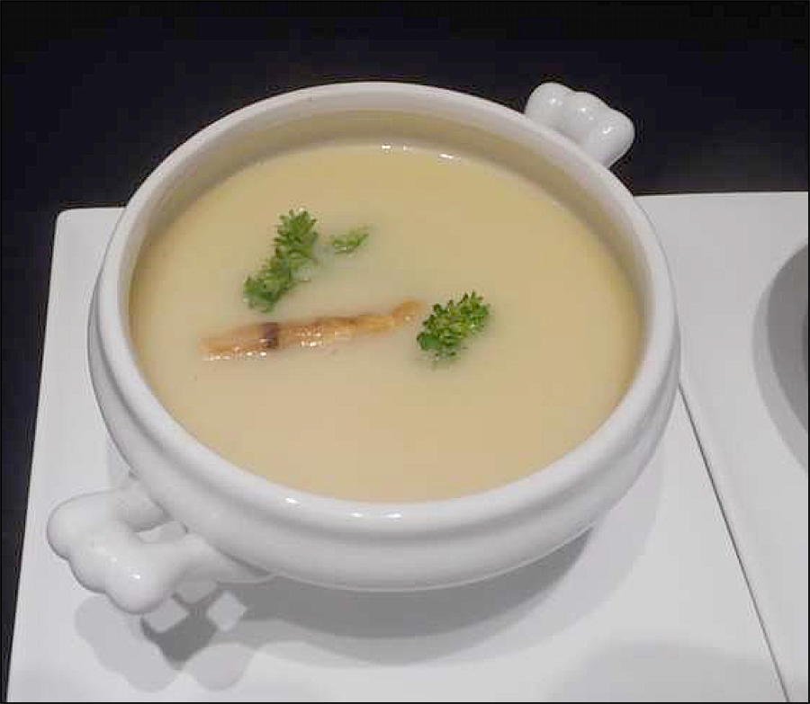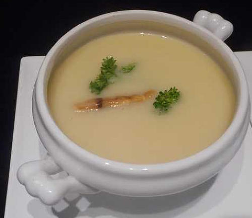 Snijd de aspergepunten af en stoom ze kort tot halfgaar. Bak ze even in een pannetje met wat boter. Kruid met peper en zout. Doe de rest van de asperges in de soepmachine (of gewone kookpot) met gesneden selder, ui en kippenbouillon. Maak de soep, meng er room door en breng op smaak met peper, zout en een snuifje komijnpoeder. Schep de soep in een diep bord. Leg er de aspergepunten in en werk af met plukjes peterselie.