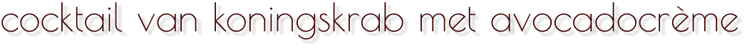 Snijd avocado in fijne blokjes. Vermeng met citroen, gesnipperde sjalot, geroosterde pitjes, peper en zout en een lepeltje yoghurt. Pureer met de handmixer of in een blender.Meng een geprakt gekookt eitje met krabvlees en gesnipperd bieslook. Kruid met wat peper, zout en cayennepeper.In het glas: een schep avocadocrème met daarop een schep krabmix. Werk af met een paar mooie stukjes uit de krabscharen en bieslook. Je kan zoals hier, nog een krabschaartje en wat citroen toevoegen aan het hapje. Ook wat geroosterde toast is vaak welkom.