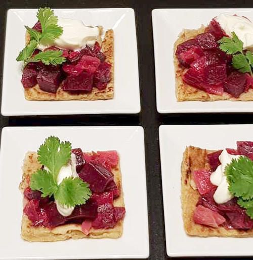 Kook een halve pompoen gaar en pureer met een paar eetlepels room. Maak een glad beslag met de pompoenpuree, gelijke hoeveelheden tarwebloem en boekweitmeel, een losgeklopt ei en peper en zout. Bak er blini’s van, in een beetje olijfolie.Sauteer gesneden ui en laat karameliseren met een beetje suiker. Blus met balsamico. Voeg in dobbelsteentjes gesneden bietjes en geraspte gember toe en laat kort meestoven. Op een bordje: een blini met daarop een schep biet. Werk af met een lepel zure room en plukjes koriander.