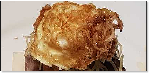 l'oignon caramélisé, l'œuf au plat et le petit pain