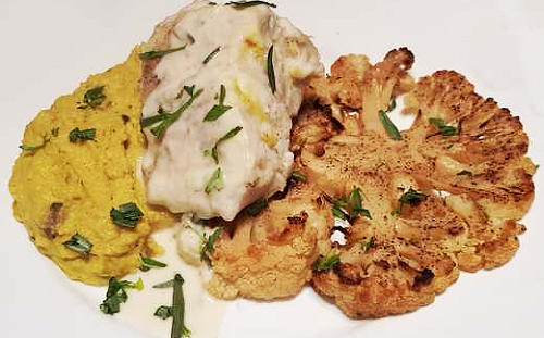 tranche de chou-fleur rôti sur l'assiette. A côté,