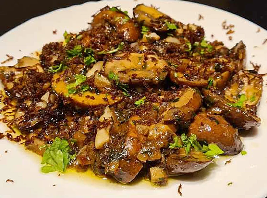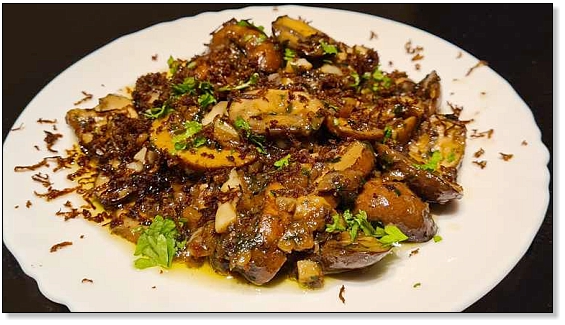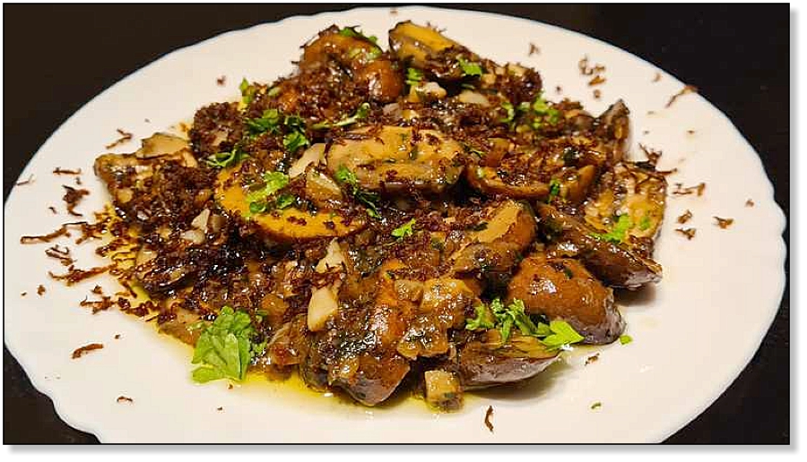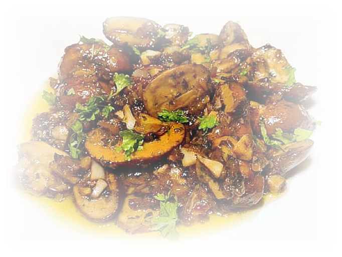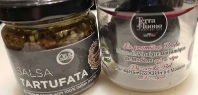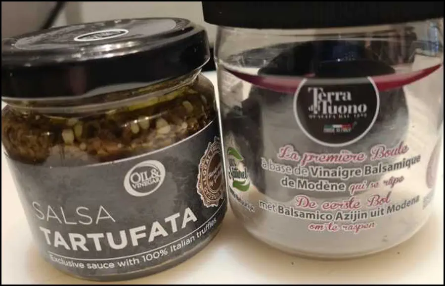 Dit is een bijzonder smaakvol bijgerechtje, vooral bij een wildgerecht in een feestelijk menu. Het is misschien even zoeken om truffelpoeder, truffelsalsa en raspbare balsamico te vinden, maar tot mijn verbazing was het beschikbaar in een bekende speciaalzaak in België. Of je kan het natuurlijk zelf importeren uit Italië als je er op vakantie bent. Niet te vinden? Geen nood. Verwerk een potje overal verkrijgbaar truffelschaafsel en een flinke scheut rode balsamico-azijn over de paddenstoeltjes en je zit qua smaak zeer dicht in de buurt.