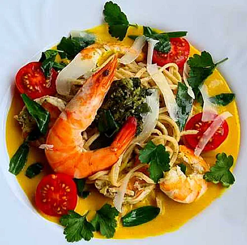 peeled king prawns in it.