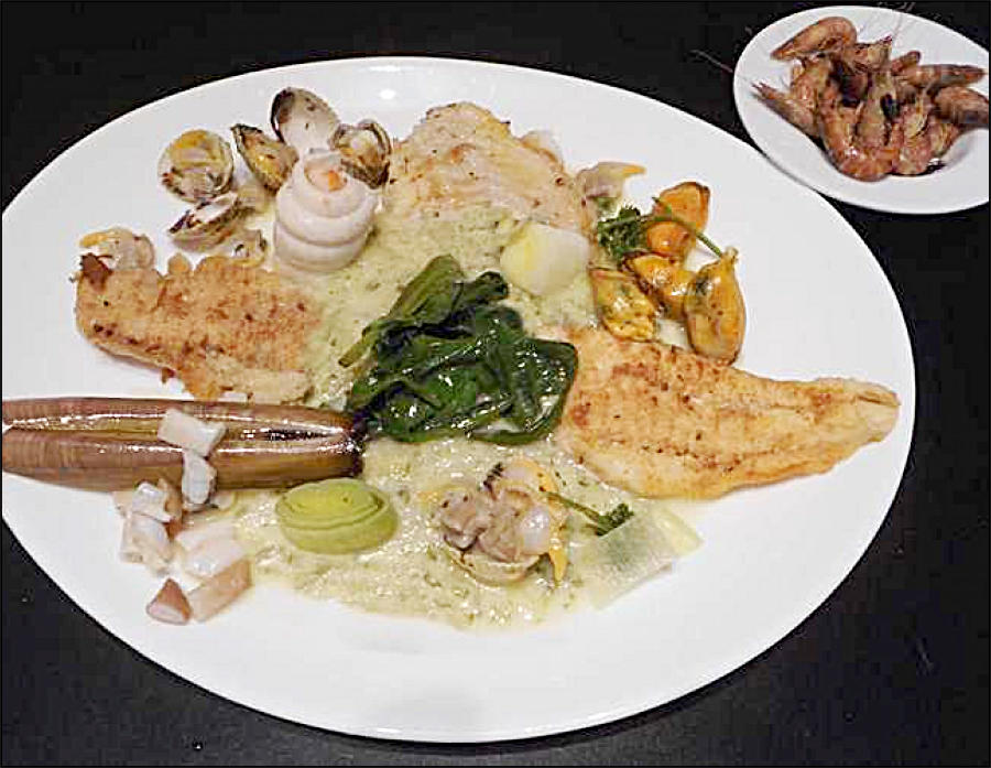 Devis: bestuif de stukken kabeljauw, pladijs en de wijting met bloem en bak ze aan beide kanten in een hete pan met boter tot ze gaar zijn en licht kleuren. Ontdoe de gekookte langoustines van het pantser en rol de staartjes in een zeetongfiletje. Zet de rolletjes rechtop in een schoteltje en stoom ze 1 à 2 minuten tot ze gaar zijn. De schelpdiertjes: verhit een weinig water met mosselkruiden en kook de venusschelpjes ongeveer 2 minuten of minder tot ze opengaan. Haal ze uit de schelp en houd ze warm. Doe hetzelfde met de scheermessen. Ontdoe de scheermesmosselen van de ingewanden.