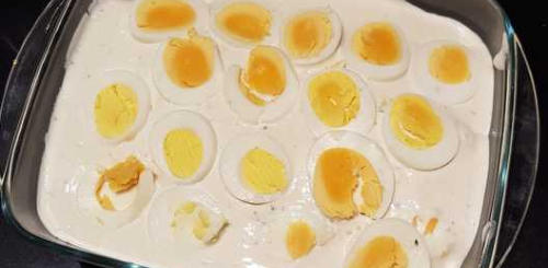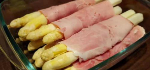 Wikkel twee asperges in een sneetje gekookte ham. Leg de hamrolletjes in een ovenschotel, ingevet met olijfolie.Bestrooi de schotel met de lente-uitjes en het bieslook. Leg daarop een laag geraspte cheddar en daarop de kaassaus en de schijfjes hardgekookte eitjes.Bedek de schotel met versgemalen gruyère. Zet de schotel 35 minuten in een voorverwarmde oven op 185°C.Dien op met gehakte peterselie.