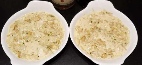Roer geraspte parmeszaan door de bereiding. Meng af het vuur met een losgeklopte eidooier en dan de gepelde grijze garnalen en gehakte peterselie. Vul schaaltjes, dek af met geraspte gruyère. Gratineer.