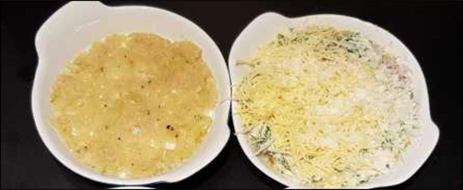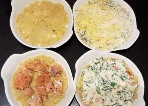 Roerbak de spinazie in een lepeltje boter en giet het vocht af. Klop een ei los met ricotta. Meng met de uitgelekte spinazie. Kruid met nootmuskaat, peper en zout.Snijd gerookte zalm in reepjes en verse zalm in centimeterdikke stukken.Vul de vispannetjes respectievelijk met een laag courgette met venkel, daarop een laag zalm en gerookte zalm. Daarop de spinazie met ricotta en bedek met een laagje gruyère gemengd met Parmezaan.Zet 25 minuten in een oven op 185°C en de laatste minuutjes onder de grill tot de kaas kleurt.