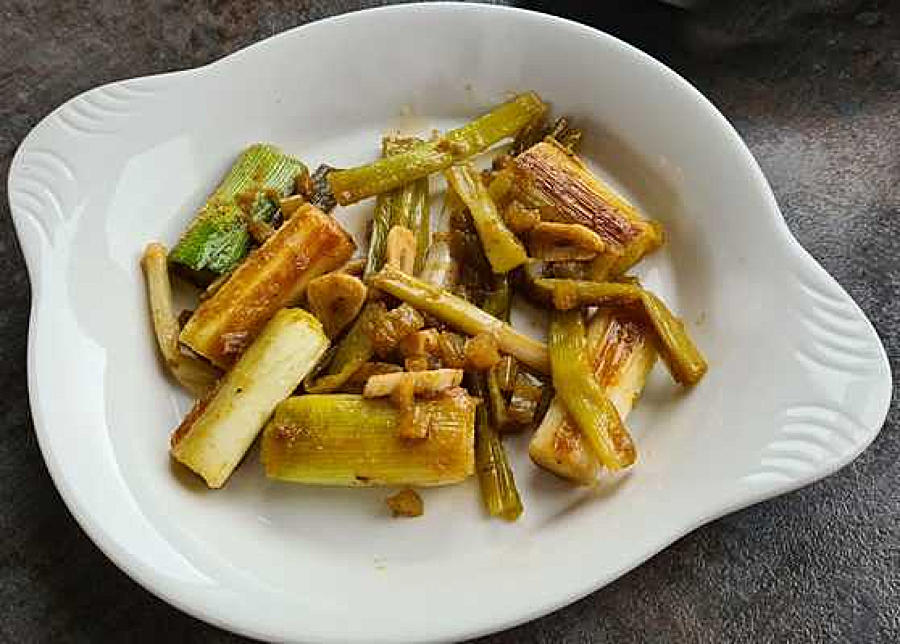 Preistaafjes. Was de preistaven en snijd het groen en de wortels eraf. Spoel grondig om zandresten te verwijderen. Snijd de prei in stukken van 3 à 4 cm. Doe hetzelfde met een bussel lente-uitjes, maar bewaar het groen en snijd dat op ringetjes. Schil een selderijstengel met een dunschiller. Snijd de staaf in de lengte in 2 à 3 repen en snijd die in dunne blokjes. Snijd een tweetal knoflookteentjes in dunne plakjes.