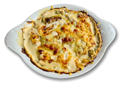 Bak de prei, lente-uistaafjes, selderblokjes en knoflook in bruisende boter. Roerbak een paar minuten tot de prei begint te kleuren. Voeg dan een half glas witte wijn en evenveel groentebouillon toe. Kruid met foelie, uienpoeder, peper en zout. Verlaag het vuur en laat gedeeltelijk uitdampen.Kaassaus. Giet een flinke scheut culinaire room in een steelpannetje en smelt daarin een kuipje kruidenkaas met bieslook. Voeg een zakje geraspte parmezaan toe en meng goed op laag vuur tot een homogene saus.Opbouw. Schep de ovenpannetjes vol met een bodem preimengsel en gesneden gekookte ham. Verdeel het groen van de lente-uitjes over de pannetjes. Bedek met een laag kaassaus. Verdeel daarover een laag gemalen Emmentalerkaas. Leg daarop een paar schijven buffelmozzarella. Kruid af met peper en zout. Zet de schoteltjes 25 minuten in een oven voorverwarmd op 185°C. Dien op met bruin brood of aardappelpuree.