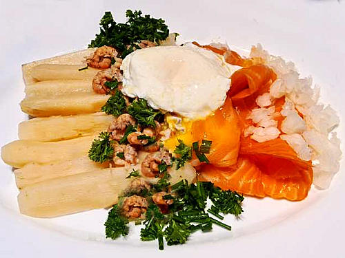 Maak de schorseneren schoon, schil ze met een dunschiller en leg ze vervolgens in water met azijn. Kook ze gaar in een twintigtal minuutjes in melk aangelengd met water. Pocheer één eitje per persoon. Breng daartoe een kookpot water vermengd met een glas azijn aan de kook. Verminder het vuur onder het kookpunt. Breek de eieren in afzonderlijke schaaltjes. Maak een kolkbeweging in het water. Giet er voorzichtig een eitje per keer in en laat 6 minuten pocheren.Snipper een kleine ui, een handvol peterselie en wat bieslook. Op het bord: een paar schorseneren. Drapeer daarover een sneetje gerookte zalm met daarop wat gesnipperde uitjes. Werk het bord af met garnaaltjes, bieslook, peterselie en een gepocheerd eitje.Dien op met cocktailsaus, tartaarsaus of hollandaise. Er hoeft verder niets bij, maar een stukje brood of wat aardappelpuree kan best.