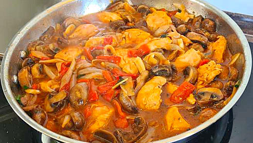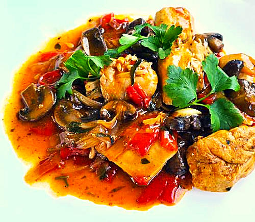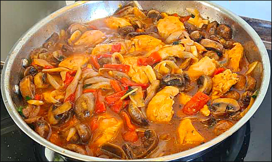 Voorbereiding. Snijd een tweetal grote sjalotten in halvemaantjes. Snijd een halve bol gepelde knoflookteentjes op schijfjes. Schil een paar puntpaprika’s met een dunschiller, verwijder de zaadjes en snijd het vruchtvlees op reepjes. Kuis een bakje kastanjechampignons en snijd ze in dikke schijven. Snijd een dubbele kippenborstfilet op grote stukken.Bereiding. Verhit een scheutje olijfolie in een diepe koekenpan. Bak de stukken kip rondom bruin. Kruid ze met kipkruiden, peper en zout. Schep ze in een bakje en zet dit afgedekt langs de kant.Laat in dezelfde pan een flinke klont boter bruisen. Stoof daarin de sjalotten, paprika’s en knoflook gaar. Meng met een glas kippenbouillon en een paar eetlepels tomatenpuree. Kruid met oregano, zacht paprikapoeder, peper en zout. Voeg de voorgebakken kip toe, roer om en laat afgedekt een kwartiertje sudderen.