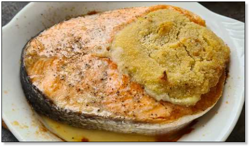 De saus. Snipper een sjalotje in een steelpannetje en fruit het in wat boter samen met een geperst knoflookteentje en twee op ringetjes gesneden lente-uitjes. Voeg toe: een flesje kookroom, een eetlepel tomatenpuree en een scheut vloeibare honing.Verwarm de saus zonder te laten koken en meng alle ingrediënten goed. Breng op smaak met peper en zout.Was een handvol spinazieblaadjes. Voeg ze toe aan de warme saus. Voeg eveneens toe: een paar gesnipperde sprieten bieslook en een handvol fijngehakte peterselie. Houd deze saus op serveertemperatuur, zonder koken.Venkelpuree. Kook één bloemige aardappel per bord gaar. Stoof in een pannetje onder gesloten deksel een grof gesneden gele ui en een in blokjes gesneden venkelknol. Voeg een tweetal geplette knoflookteentjes toe. Doe deze mix samen met de gekookte aardappelen in de keukenrobot. Voeg een flinke klont boter en een flesje kookroom toe. Kruid met nootmuskaat, peper en zout. Giet er twee borrelglazen pastis bij.Mix de bereiding tot een mooie gladde puree. Die moet redelijk consistent zijn maar toch ook weer niet te droog. Corrigeer de dikte met room of paneermeel.De zalm. Kies voor individuele vispannetjes. Bestuif de bodem en de randen met olijfoliespray. Schik een zalmmoot in elk pannetje. Bestuif ze met olijfoliespray. Schep een paar eetlepels venkelpuree in de uitsparing van de buikholte. Leg daarop een flinke klont boter en bedek de puree met paneermeel.Schuif de vispannetjes in een oven voorverwarmd op 185°C. stel de timer in op 25 minuten.