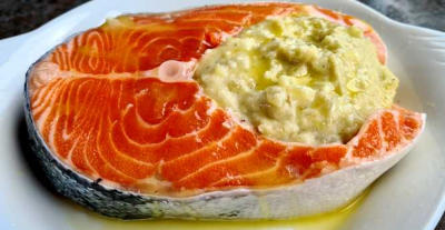 Afwerking. Maak een gepelde tomaat leeg en snijd het vruchtvlees in dobbelsteentjes. Overgiet de zalm (niet de puree) met de vooraf klaargemaakte saus. Werk de pannetjes af met deze verse tomatenblokjes, grijze garnaaltjes, gesnipperde verse bieslook en ringetjes van pijpajuin. Er zijn geen bijgerechtjes nodig, behalve misschien een beetje stokbrood.