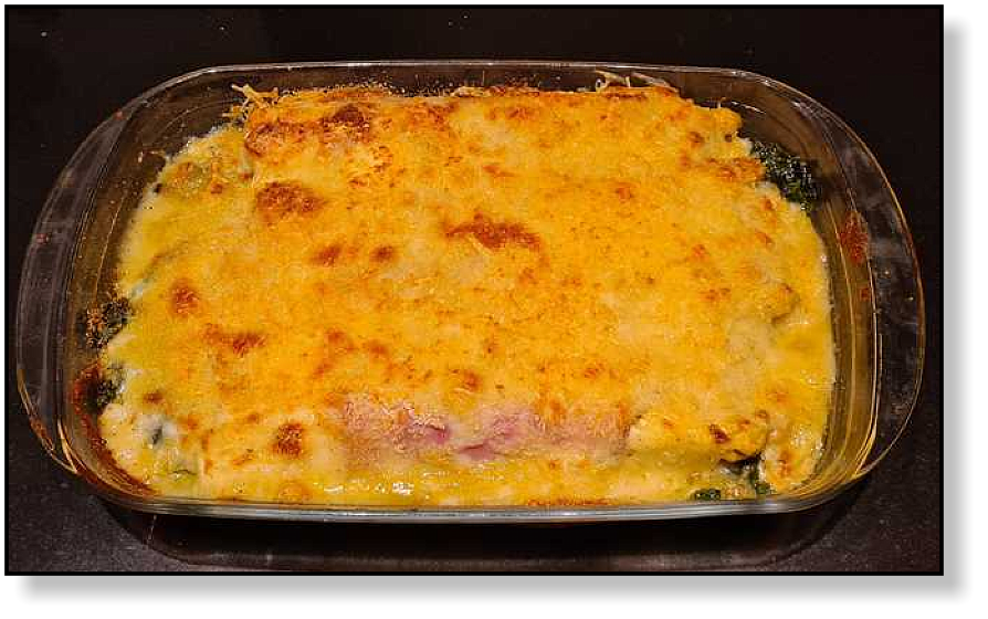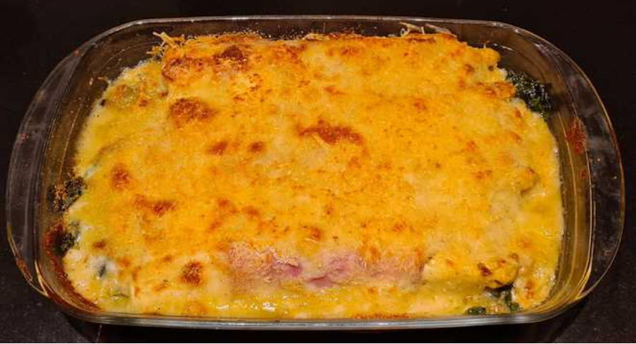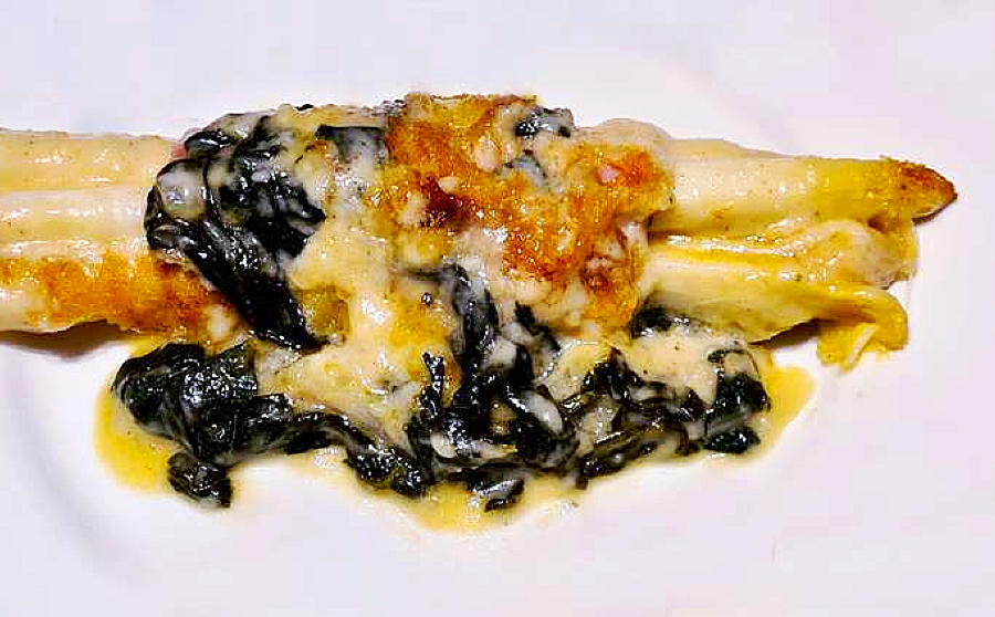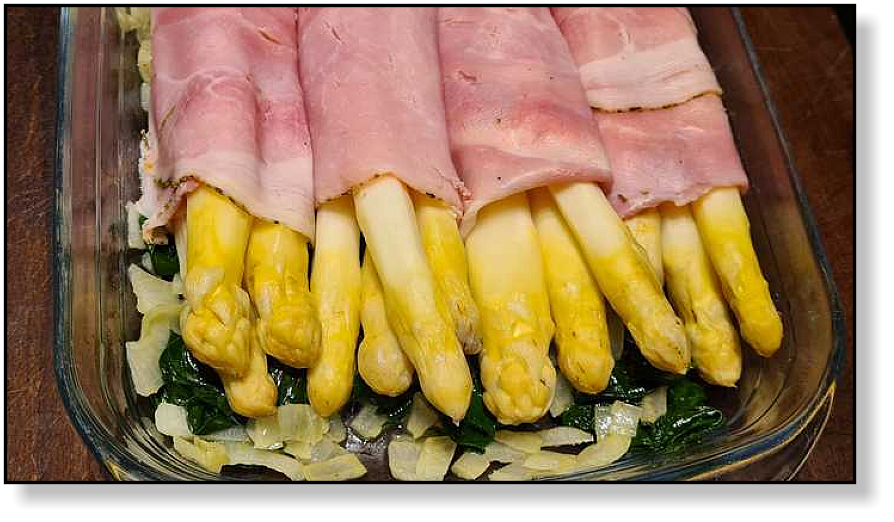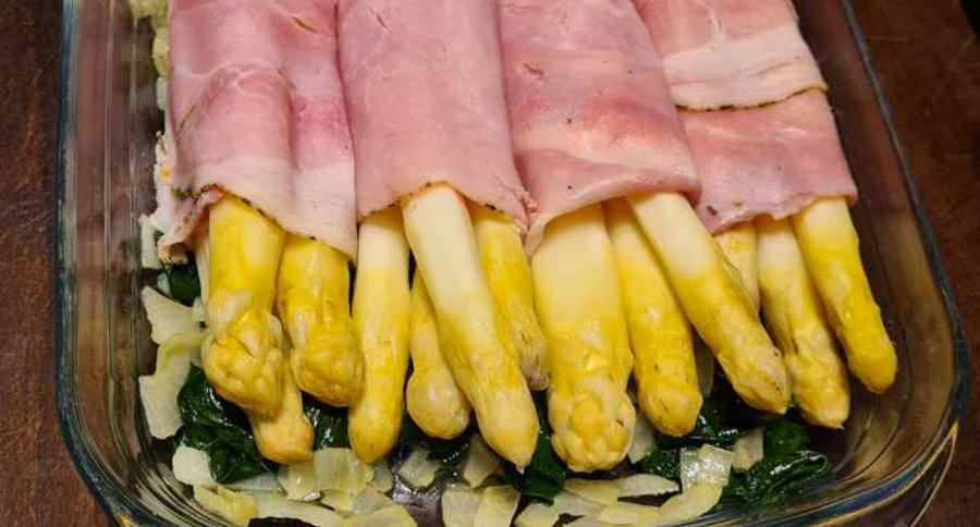Stoom de asperges 3 tot 5 minuutjes, afhankelijk van hun omvang. Ze hoeven niet gaar te zijn. Laat ze even afkoelen en wikkel ze dan per drie stuks in een tweetal sneetjes gekookte ham. Schep in een ovenschotel een laag spinazie met ui. Leg daarop de rolletjes van asperge met ham. Giet er de kaassaus over en verdeel die gelijkmatig. Eindig met een laagje geraspte gruyère, verrijkt met wat geraspte parmezaan en bedek het oppervlak met een dun laagje paneermeel.Schuif de schotel 25 minuutjes in een oven voorverwarmd op 185°C. zet de laatste vijf minuutjes de ovengrill op om een mooi gekleurd resultaat te hebben.Dien op met gekookte aardappeltjes.