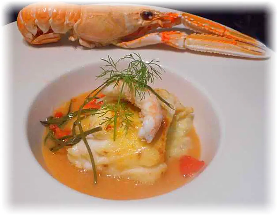 De saus: Haal het staartvlees uit de rauwe langoustines en verwijder het darmkanaal. Snijd sjalot, wortel en knoflook fijn. Bak het afval van de langoustines en de groenten in olijfolie. Voeg kippenbouillon, Monbazillac (zoete witte wijn) en tomatenpuree toe. Laat 20 minuten sudderen. Zeef de saus en laat inkoken. Voeg room en zacht paprikapoeder toe. Laat nog even inkoken tot sausdikte of bind de saus. De vis: maak geklaarde boter en bak er de vismoten in. Kruid met viskruiden. Bak ook de rauwe langoustinestaartjes in de geklaarde boter. Groenten: snijd prei en venkel op blokjes, stoof in wat boter en voeg gesnipperde dragon toe. Pureer. Roerbak de zeevenkel in een wokpan in wat olijfolie.Dresseer de borden, bij voorkeur diepe sombreroborden, naar eigen inzicht en ervaring.