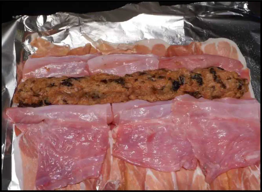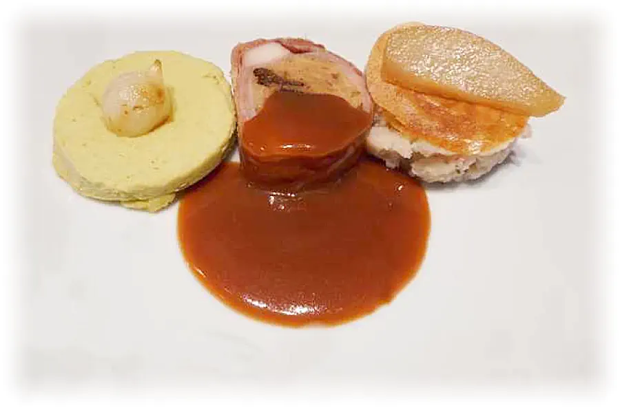 Vulling: hak de pruimen in kleine stukjes. Meng met kippengehakt en breng op smaak met peper en zout. Voeg een flinke scheut Pineau des Charentes toe en meng grondig.De roulade: strijk 2 grote vellen aluminiumfolie in met olie en leg er Parmaham dakpansgewijze op. Klop de rugfilets plat en leg ze op de ham. Leg de vulling in het midden op de filets. Maak een rol en sluit de uiteinden. Bak 1 uur in een oven op 185°C. Laat even rusten, verwijder de folie en zet de rol nog 15 minuten terug in de oven. Snijd de rol in schijven, net voor het opdienen. Knolselderpuree: kook blokjes knolselder in melk. Giet af, laat uitlekken en mix tot mousseline. Kruid met nootmuskaat, peper en zout. Spruitjesflan: stoom 300 gr spruitjes gaar. Voeg 3 geklutste eieren en 2 dl room toe en pureer tot een homogene massa. Breng op smaak met kruiden. Schep de spruitjesbereiding in ingeöliede ramekins en zet deze 30 minuten au bain marie in een oven op 185°C.