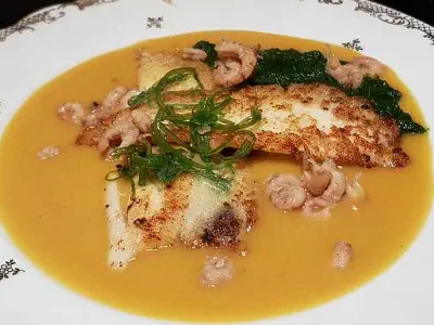 On the dinner plate: a mirror of shrimp sauce,