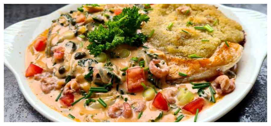heek in sinaasappel-tomatensaus vlinders van tijgergarnalen in knoflookroomsaus de              passie Creatief Koken kookvurige