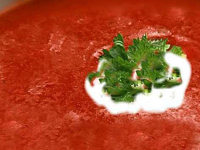 In een diep bord: een soeplepel borsjtsj, daarop een kwak zure room, daarop een toefje gehakte peterselie en afwerken met geprakt ei.