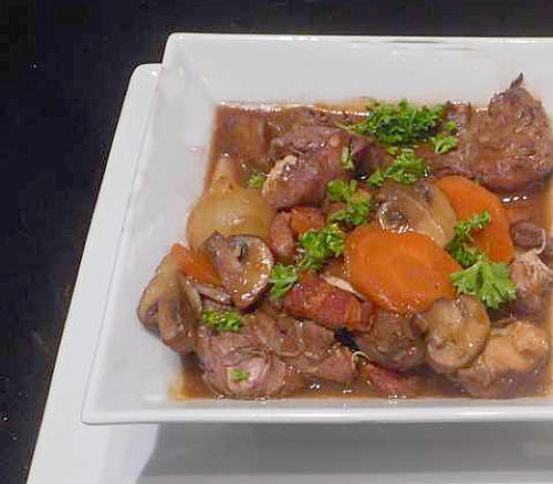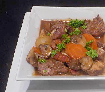 kip rode wijn champignons boter spekjes kippenfond aalbessengelei