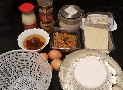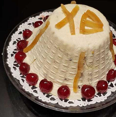 Laat 1 kg ricotta 12 uur uitlekken in een fijne neteldoek onder gewicht. Druk daarna door een fijne zeef en roer tot een gladde crème met 125 g boter op kamertemperatuur. Klop 4 eidooiers met de 200 g fijne suiker en 20 g vanillesuiker tot een ruban. Voeg op een zacht vuurtje en zonder te koken 225 g room toe. Spatel dit mengsel door de kaas, samen met 225 g amandelpoeder, gekonfijt fruit en rozijnen geweekt in bruine rum.
