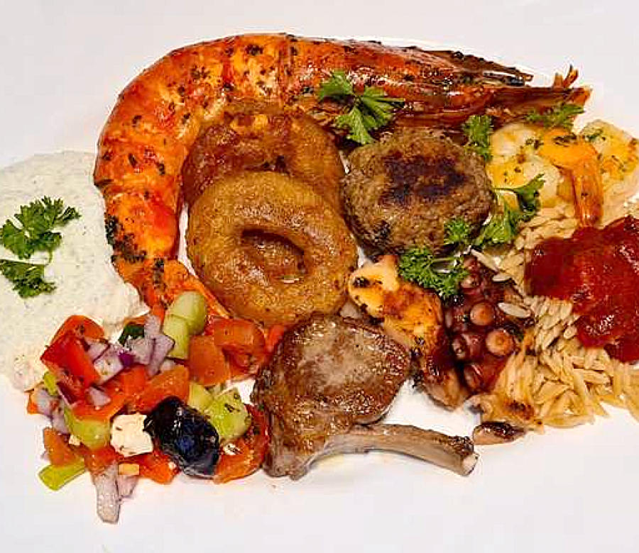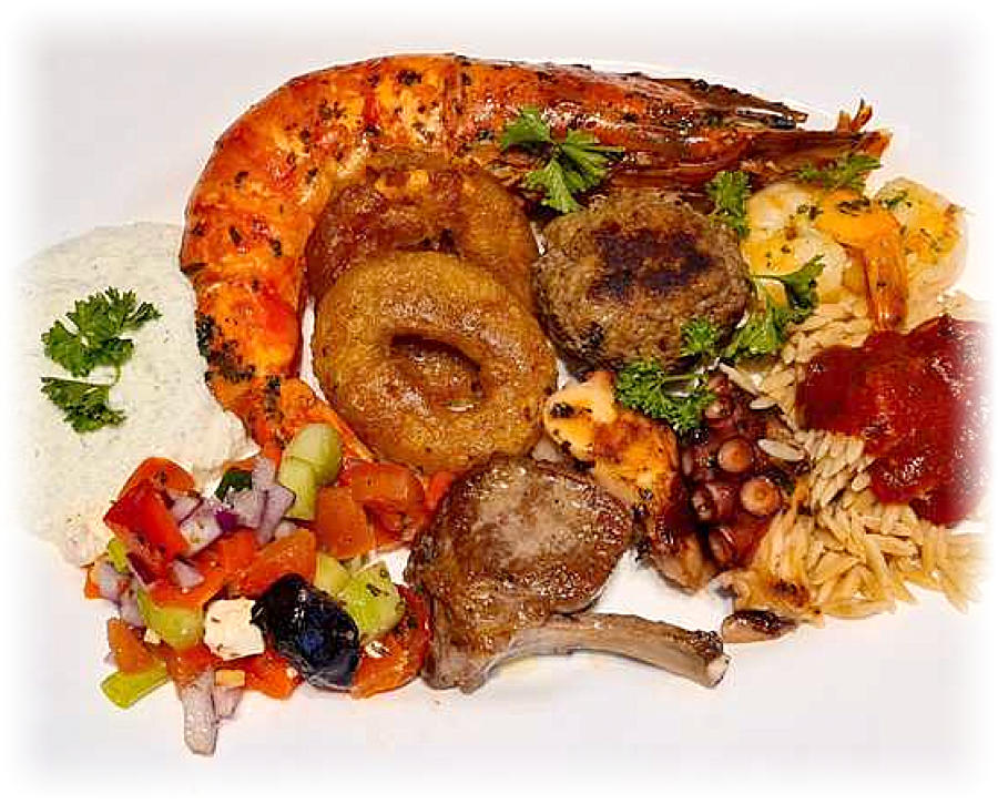 De schotel op foto is samengesteld uit gefrituurde gepaneerde inktvisringetjes, scampi’s in kruidenboter, gebakken octopus, een gigantische tijgergarnaal, tzatziki, een schep Griekse salade, vleesballetjes, een lamskoteletje, gekookte Griekse pasta met een tomatensausje. Afgewerkt met plukjes peterselie.