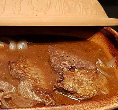 Niet de schnitzel, maar de Wiener Rostbraten wordt algemeen erkend als het nationale gerecht van Oostenrijk. De biefstukken worden niet gepaneerd. Wat de Altwiener Zwiebelrostbraten zo bijzonder maakt, is dat het vlees niet kort gebakken wordt, maar gestoomd totdat het boterachtig zacht is. Om die reden is de bereiding van het gerecht met de Römertopf ideaal. Weet wel dat dit niét de klassieke bereidingsmethode is, maar een variant die ik zelf uitgetest heb. Voor wie het échte ding wil, zorg er dan voor dat je deze schotel opdient met Knödel en dat de uiringen die je bij de afwerking op het vlees legt, knisperend krokant gebakken zijn.