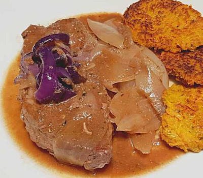 Op het bord: een biefstuk overgoten met saus. Leg daarop een hoopje gefrituurde ui. Als bijgerecht kan je kiezen voor een aardappelbereiding of broodknoedels. Hier werd het gerechtje gepresenteerd met rösti van zoete aardappel en wortel. Het hoeft niet, maar je kan er ook een potje zure room en in waaiervorm gesneden augurkjes bij serveren.