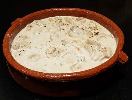 Laat zachtjes een paar minuten sudderen tot alle smaken goed vermengd zijn. Schep de bereiding in individuele ovenschotels van aardewerk. Zet ze 30 minuten in een voorverwarmde oven op 185°C. Variant: dek de ovenschotels af met geraspte Gruyère en zet ze dan in de oven. Dien recht uit de oven op met frietjes.