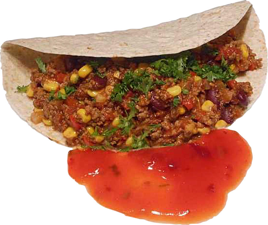Bak zuiver rundsgehakt rul in olijfolie. Sauteer in een andere pan zeer fijngehakte ui, knoflook en rode paprika. Voeg beiden samen en doe er een kruidenmix bij van zacht paprikapoeder, komijnpoeder, cayennepeper, koriander, marjolein, peper en zout.Voeg er na een paar minuutjes een groot blik tomatenpuree aan toe en meng goed tot de bereiding een egaal rode kleur heeft. Laat even sudderen en doe er dan een blik rode bonen en een blik maïskorrels bij. Meng weer alles goed en laat het indien mogelijk een tijdje rusten om de smaken te mengen. Dien warm op met gehakte peterselie en warme tortilla’s. Een beetje tabasco en/of chilisaus zorgt voor aanpassing aan het persoonlijke smakenpalet.