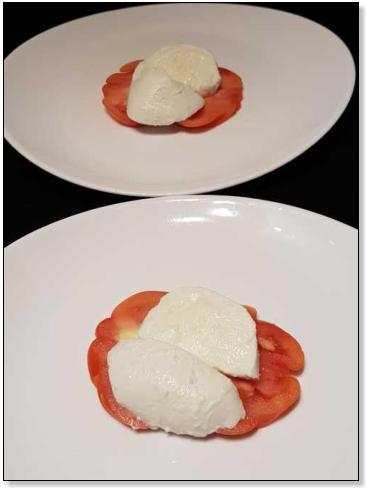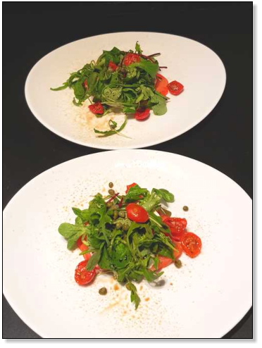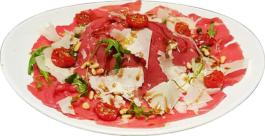 Carpaccio als hoofdschotel: leg op het bord eerst een paar schijfjes tomaat met daarop een schijf buffelmozzarella. Leg daarop een handvol gemengde sla van ruccola, rode biet en veldsla. Besprenkel met olijfolie en balsamico. Leg er een paar halfgedroogde kerstomaatjes bij. Drapeer de dunne schelletjes rund over het torentje in het midden van het bord en werk verder af zoals hierboven uitgelegd.