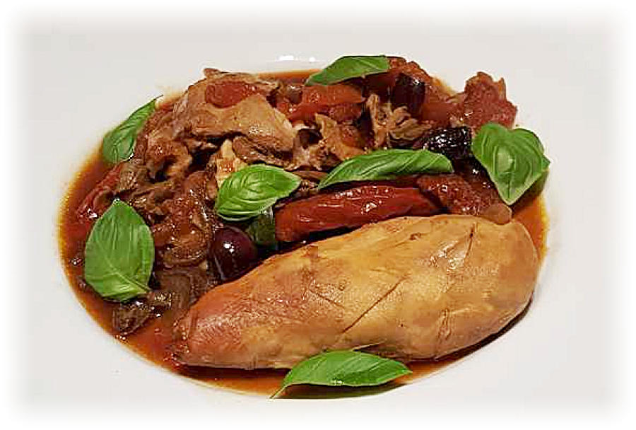 Zet de pot met het deksel erop, in een koude oven. Stel de temperatuur in op 200°C en de tijd op 1 ½ uur. Verwijder een kwartier voor het einde van de kooktijd het deksel en laat de pot nog een kwartiertje staan onder de grill. Controleer of de kip gaar is. Werk voor het opdienen af met verse basilicum en zwarte olijven zonder pit.