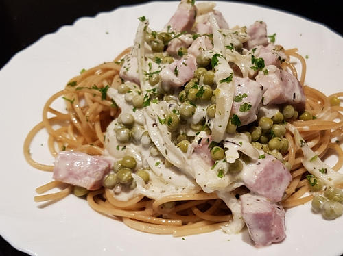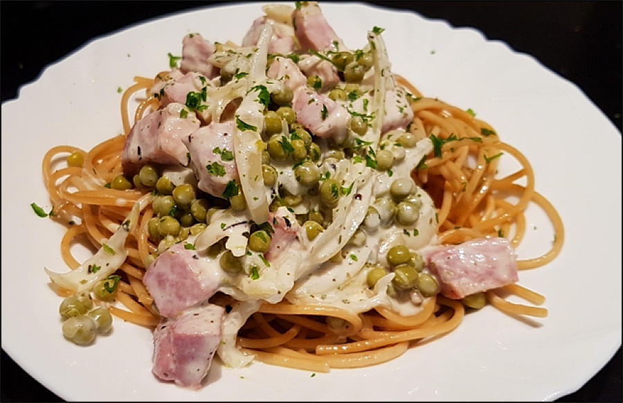 Dit is niet écht een origineel Italiaans recept. Maar omdat het handiger is om alle pastagerechten op deze website gegroepeerd te hebben, staat het hier. En er zit spaghetti in, dus…Deze schotel is evenwel bijna zo Belgisch als de gegratineerde macaroni met kaas en hesp. Het is bovendien een soort familie-erfstuk met jeugdherinneringen. Stevige winterkost bovendien, met doperwten en petit salé. Dit gezouten varkensvlees is een Franse specialiteit. Het vlees wordt een tweetal dagen in pekel gezet. Je kan het in water ontzouten indien gewenst, maar dat hoeft niet. Vermijd wel de toevoeging van zout in de rest van de bereiding.