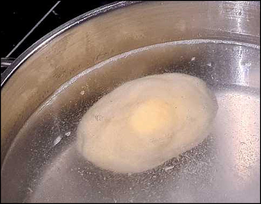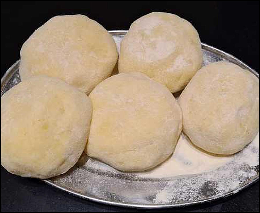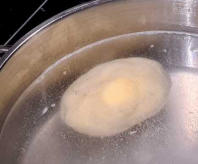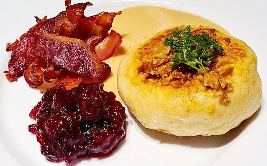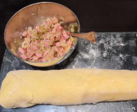 Het aardappeldeeg. Kook de aardappelen in gezouten water. Pureer ze met een aardappelstamper in een kom en laat ze afkoelen. Meng met een losgeklopt ei en de bloem. Kneed met de hand en maak er een stevig droog deeg van, dat aanvoelt als brooddeeg. De vulling. Snijd een centimeter dikke schel gekookte ham voor de vulling in kleine blokjes. Schil de ui en hak deze fijn. Bak het vlees in wat boter en voeg de gesneden ui toe. Laat ongeveer 3 minuten bakken. Kruid met peper en zout.Afwerking. Leg het aardappeldeeg op een met bloem bestoven werkblad en vorm het tot een rol. Verdeel die in gelijke delen. Rol elk stuk deeg tot een rond broodje. Maak een kuiltje in het broodje en vul het met 1 à 2 eetlepels van het gebakken vleesmengsel. Knijp samen en vorm opnieuw tot een broodje. Bestuif de ballen met bloem.Breng een pot water aan de kook met een schep zout. Leg voorzichtig een paar aardappelbollen in het water en verlaag het vuur tot tegen het kookpunt. Na een paar minuten beginnen de bollen te drijven. Reken er nog 5 minuten gaartijd bij en schep ze dan uit het water. Druk ze met een spaan een beetje plat.Laat de aardappelknoedels afkoelen tot lauw. Verwarm een flinke klont boter in een pan. Bak de knoedels aan beide kanten tot er een korstje aanwezig is. Zet ze warm opzij tot het moment van opdienen.