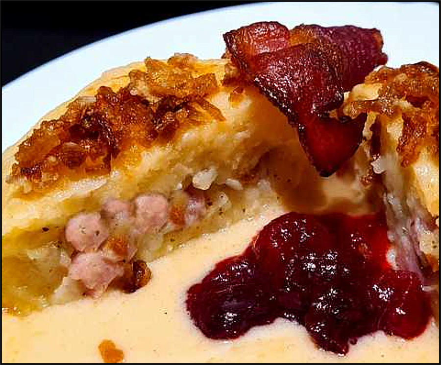 De botersaus. Meng 4 delen boter met 1 deel vloeiende bloem in een warme pan. Leng aan tot de gewenste sausdikte met vleesbouillonen een flinke scheut room. Breng op smaak met peper en zout. Andere bereidingen. Bak een hoeveelheid ontbijtspek krokant. Maak een veenbessencompote door de veenbessen op te zetten met een scheutje water en een paar eetlepels bruine suiker. De compote is klaar als de bereiding stroperig wordt en aan een lepel blijft kleven.Op het bord. Een pollepel botersaus met daarnaast een aardappelbol. Deze wordt afgewerkt met gedroogde gebakken uitjes en toefjes peterselie. Leg daarnaast een schep veenbessencompote en een paar reepjes krokant spek.