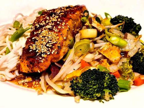 bord. Overgiet met teriyakisaus. Werk de zalm