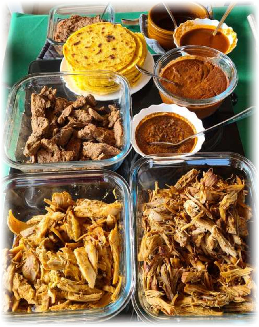 Een voorbeeld van assortiment: als hoofdingrediënten om de taco’s te vullen hebben we bereidingen met rundsvlees, varkensvlees en kip. De belangrijkste bijgerechten zijn pico de gallo en guacamole. Maar zorg bovendien voor verse groenten zoals sla, tomaten, gesneden ui, radijsjes, komkommer en niet te vergeten, jalapeno pepertjes. De mole poblano is de meest in het oog springende saus, die best past bij de kip, maar waarom ook niet bij varken of rund? Andere sausjes maak je door het zeven en inkoken van de marinades die je gebruikt of zet er kant-en-klare Mexicaanse sausjes bij.