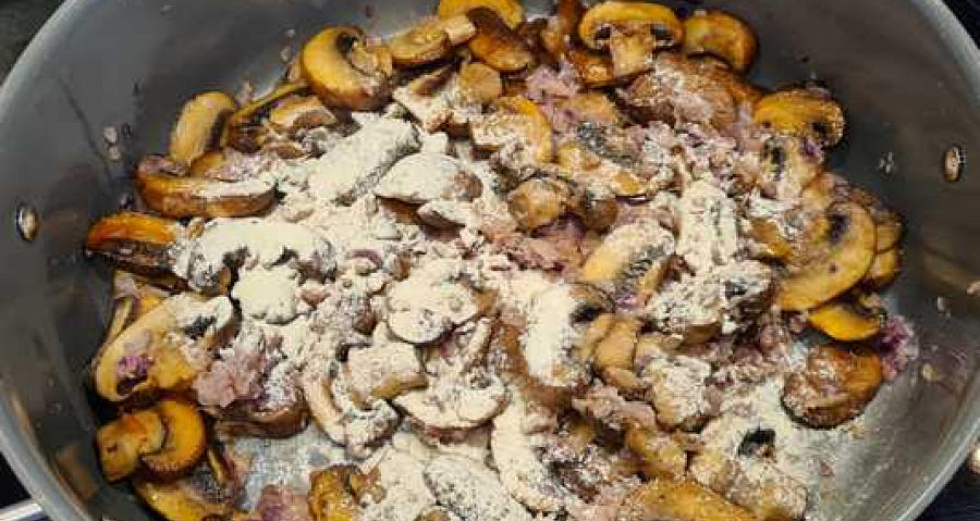 bord. Schep er champignons en saus over.